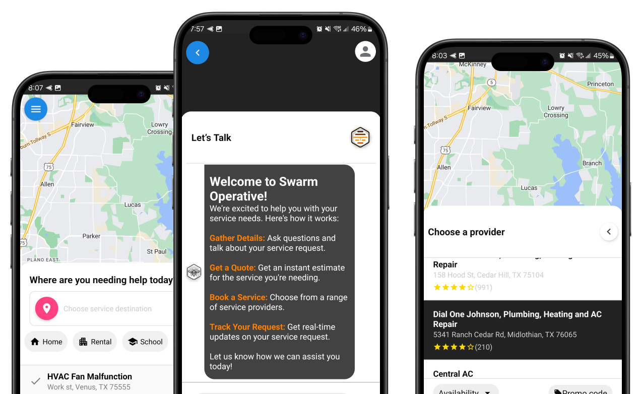 Transform the way you handle repairs and projects. With Swarm Operative, getting started is simple—unlock instant access to estimates and trusted pros, all in one easy-to-use app